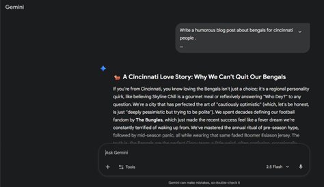 I used my prompt builder to generate a simple request: Write a humorous blog post about the Bengals for Cincinnati people.